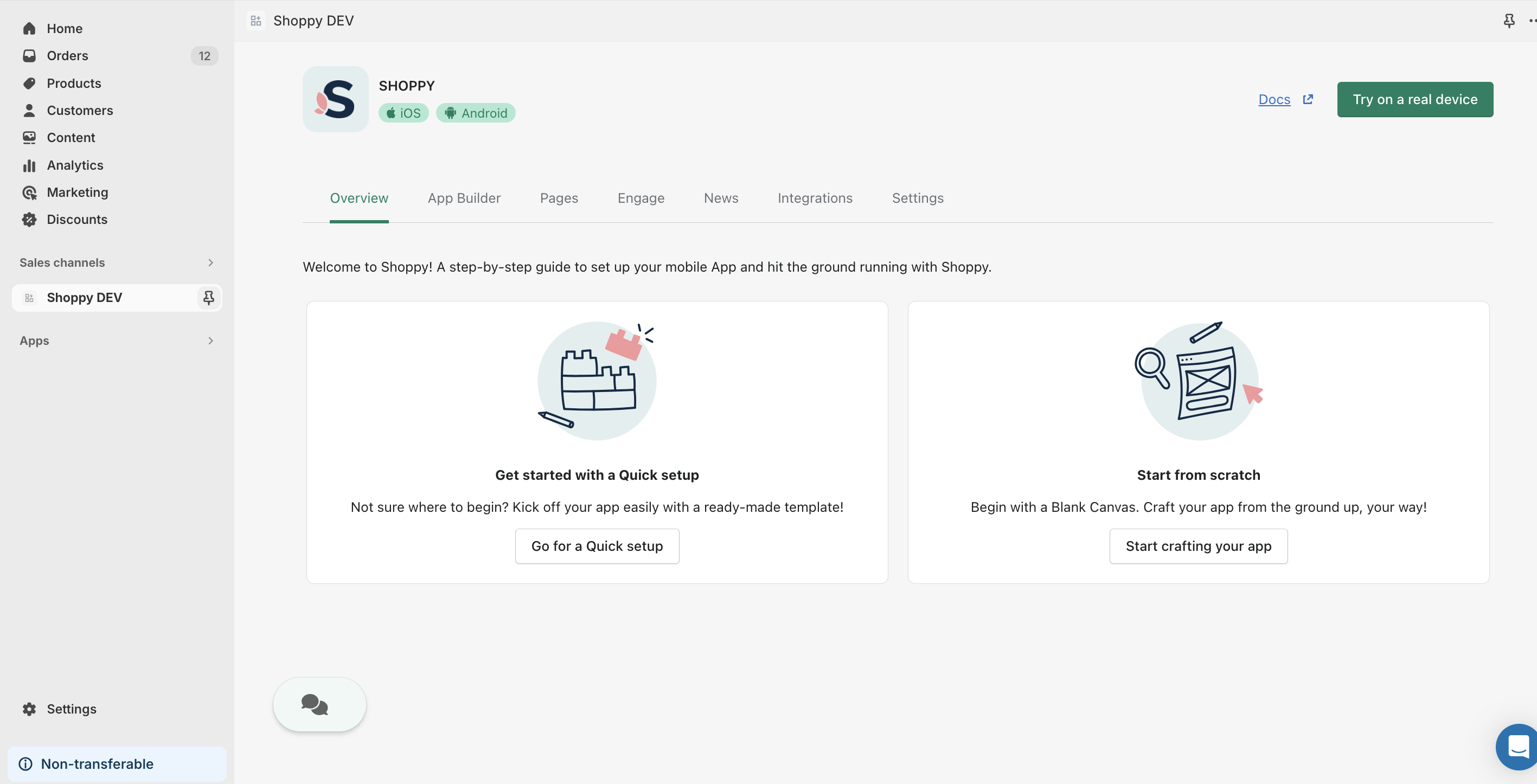 In the Overview section, you will be given two options on how you'd like to set up your app; **Quick Setup** or **Start from Scratch**.