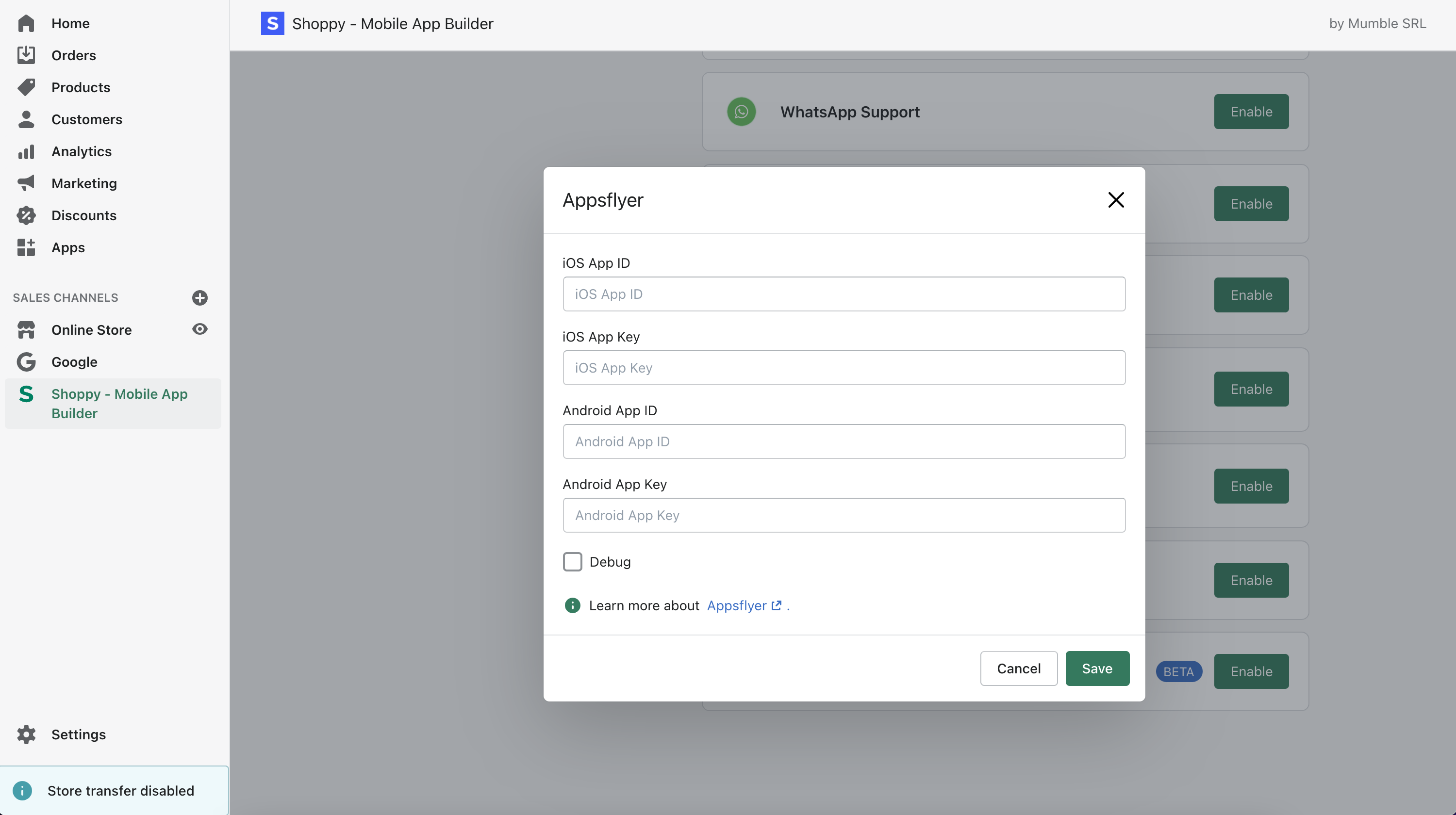 The Application ID is what you see on the main AppsFlyer page under the application name. To get the Development Key, open the app and navigate to "App Settings" from the side menu under SDK authentication you will find the Development Key. All you have to do is activate the integration from the Shoppy dashboard and enter the data you got in the previous steps (leave the Debug box unchecked). Translated with DeepL